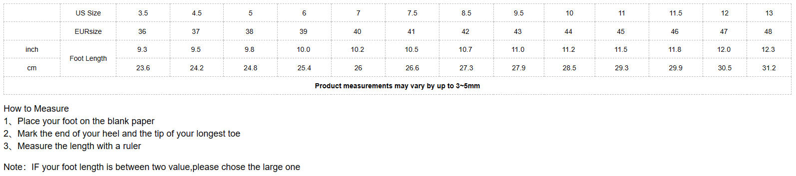 Note:IF your foot length is between two value,please chose the large one